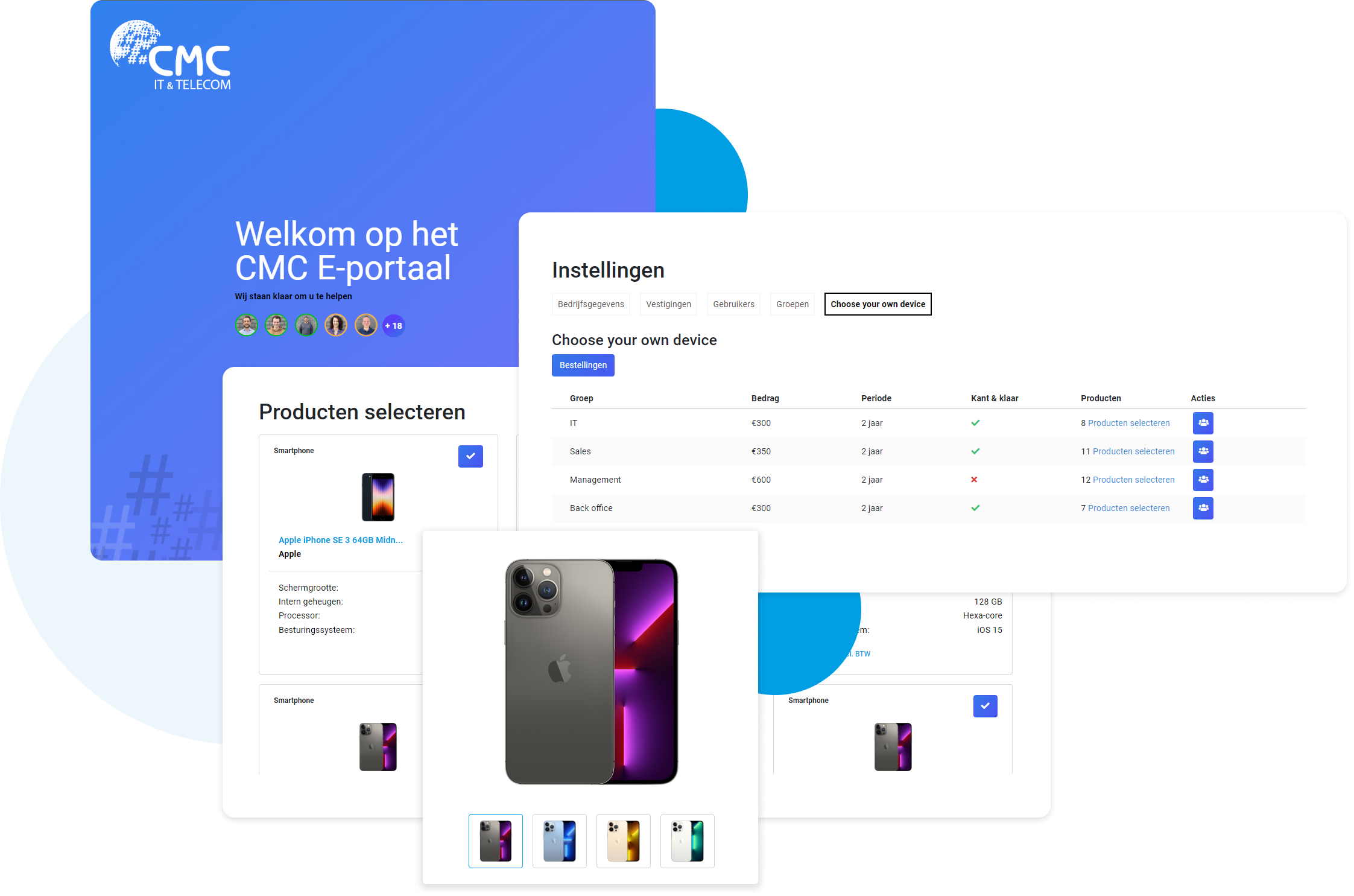 We gaan zelfs nog een stapje verder. Op ons CMC E-portaal kiezen jouw medewerkers online hun nieuwe toestel, via ‘Choose your own device’. Jij geeft het budget in en met die voucher bestelt je werknemer z’n toestel. Het bespaart je HR-afdeling en boekhouding een hoop administratief werk. En net dát is ontzorgen.